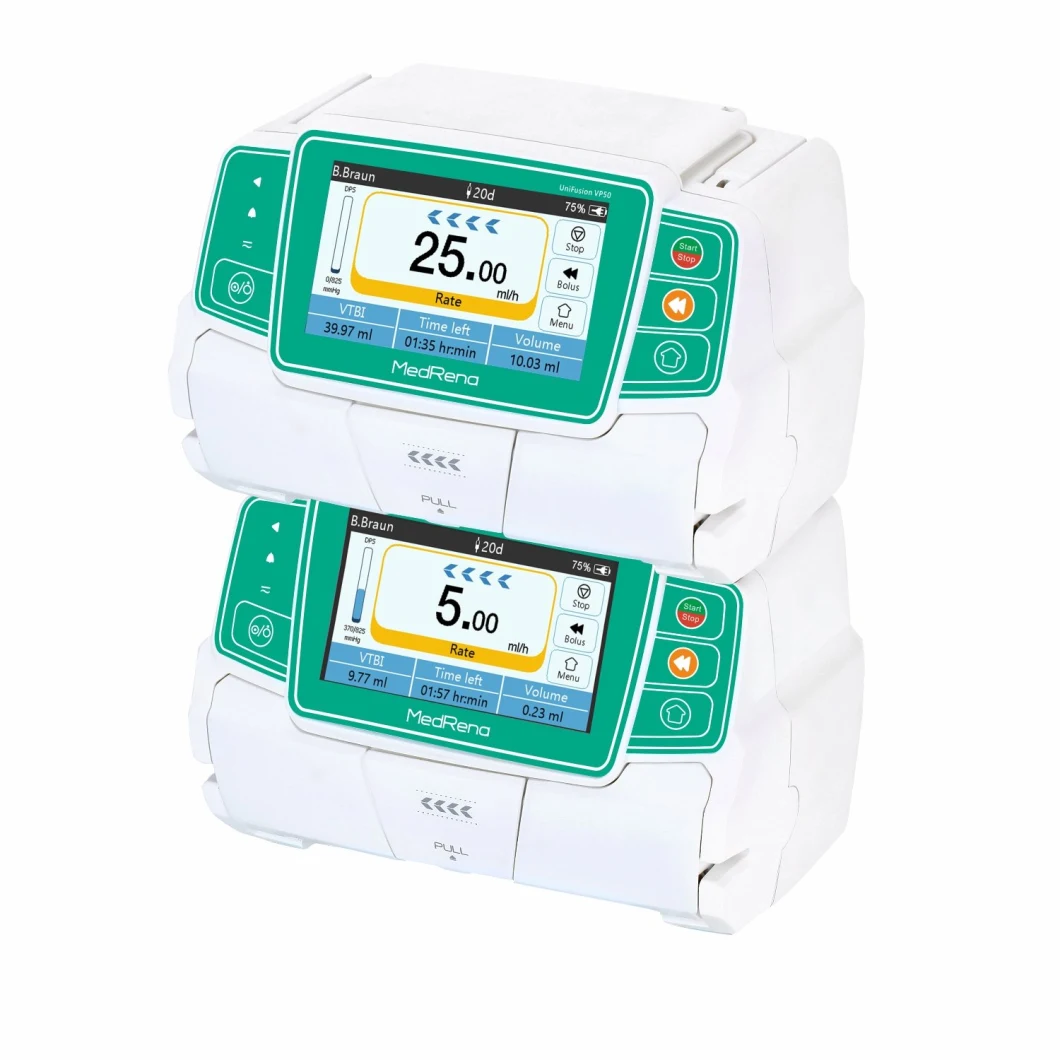 Small size portable medical equipment UniFusion VP50 Infusion PumpMedRena Infusion Pump Product Highlights:4.3 \'\' color touch screen.5 infusion modes.High accuracy & complete alarm system.Up to 11hrs battery life, max 5hrs charging.DERS, DPS, IrDA, WiFi, RS232.Micro mode, nurse call, data export, ext.30 drug lib. & 500